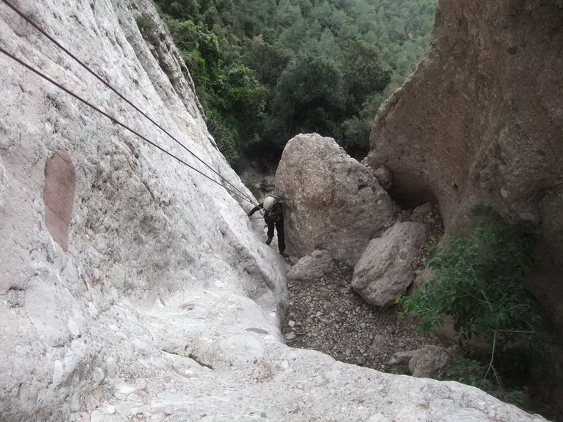 El ràpel més llarg és de 15 metres que baixa recta per un caos de roques.